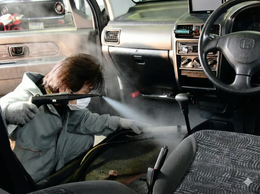 仕上げには、オゾンの強い酸化力を活かした消臭・除菌を実施。タバコ臭・ペット臭・エアコンのカビ臭などの頑固なニオイをしっかり分解・除去し、風邪や食中毒ウイルス対策としても効果を発揮します。オゾンは施工後に残留物質を出さない安全性の高い物質のため、作業直後でも赤ちゃんやペットを安心して乗せていただけます。