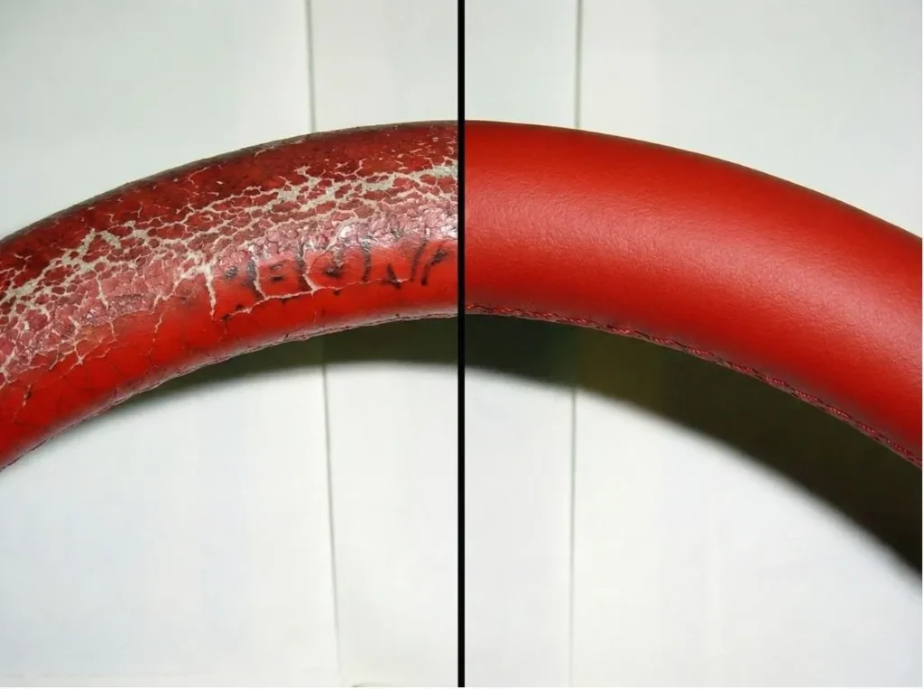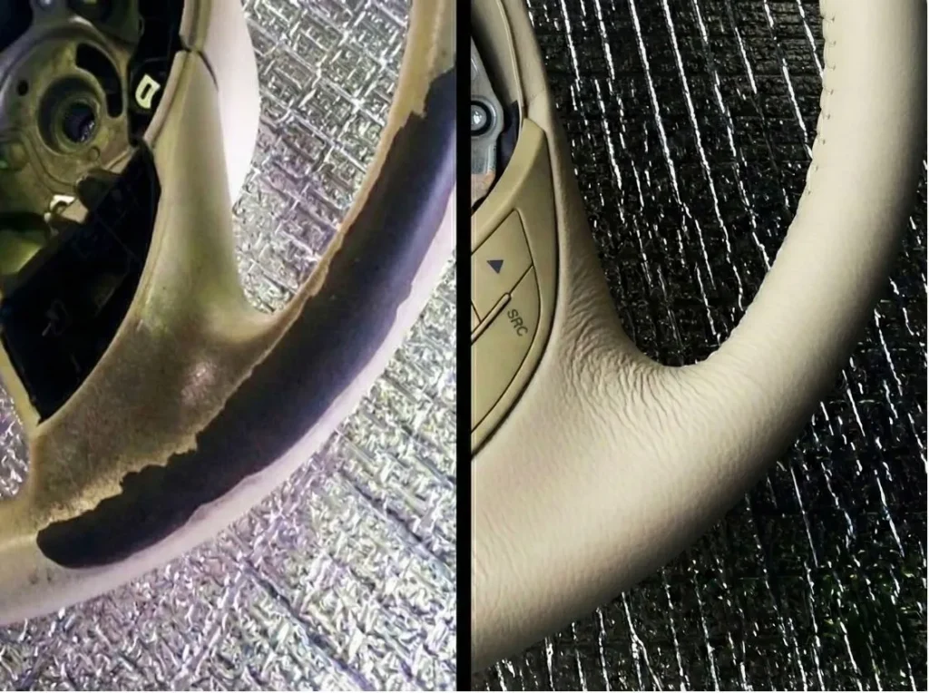 革シート・ステアリングの補修および張替えを承っております。使用による擦れや色あせ、キズなども、素材や状態に合わせて丁寧に修復します。また、インパネをはじめとした内装各部の色替え・補修にも対応。細部までこだわる職人ならではの仕上がりは、ぜひ実際にご覧いただきたいクオリティです。